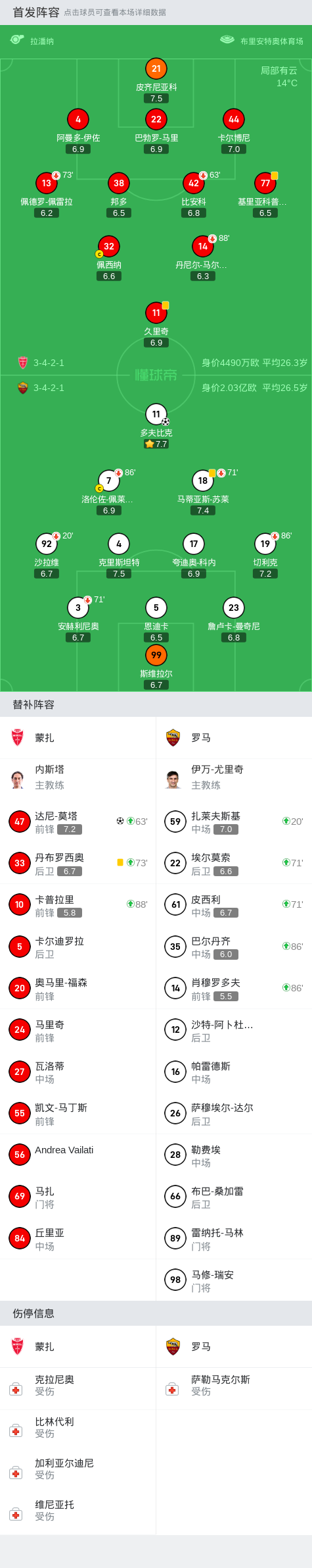 在意大利足球顶级联赛第7轮的比赛中,蒙扎在主场迎战罗马,双方展开了一场激烈的较量。首开纪录的是罗马队,第61分钟,多夫比克扛倒防守杀入禁区,横带低射破门,为罗马取得了领先。蒙扎队并没有灰心丧气,第70分钟,达尼-莫塔在门前补射得手,将比分扳平为1-1。双方在接下来的比赛中争夺激烈,最终以握手言和告终。